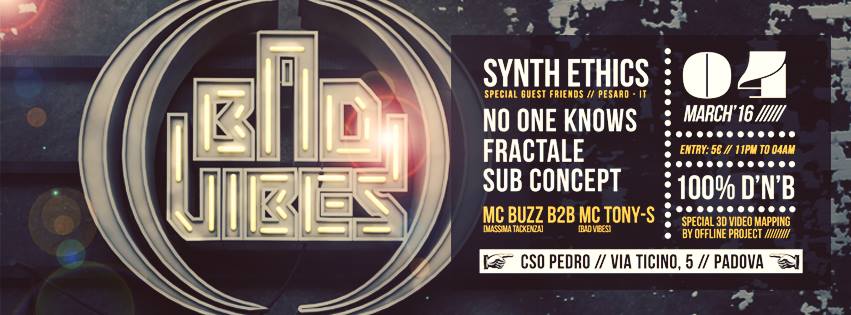 ► Ven. 04.03 / BAD VIBES w/ SYNTH ETHICS// 100% DRUM'N'BASS @ Cso Pedro (PD) ✖ Torna al Cso Pedro di Padova la BAD VIBES Crew al completo per il quarto party 100% DNB ! La vostra cricca di bassliners preferita vi farà divertire nel migliore dei modi a suon di bassoni e amen breaks, una sessione speciale di videomapping degli amici Offline Project e degli ospiti speciali: SYNTH ETHICS. ReaDY tO jUMP !?!?!? ► Lineup: ▂ ▃ ▄ ▅ ▆ [SYNTH ETHICS ] ▆ ▅ ▄ ▃ ▂ ► https://soundcloud.com/synthethics ▲ I Synth Ethics sono un duo di produttori di bass music provenienti da Pesaro, Marche. Usciti dall’ombra nell’estate del 2015, si stanno velocemente costruendo una reputazione: i loro dubplate sono stati più volte in scaletta nello show di Friction sulla BBC1 Xtra e sulla residency di Icicle su RinseFM. Caratterizzati da una accurata ricerca sonora, il loro sound è potente e innovativo. ▂ ▃ ▄ ▅ ▆ [ NO ONE KNOWS ] ▆ ▅ ▄ ▃ ▂ ► http://www.facebook.com/nooneknowsofficial ► http://soundcloud.com/nooneknowsofficial ▂ ▃ ▄ ▅ ▆ [ SUB CONCEPT ] ▆ ▅ ▄ ▃ ▂ ► https://www.facebook.com/SUB-CONCEPT-149435101833575/ ► https://soundcloud.com/beeonex ▂ ▃ ▄ ▅ ▆ [ Fractale ] ▆ ▅ ▄ ▃ ▂ ► https://www.facebook.com/fractale.official ► https://soundcloud.com/fractale-music ► Hosted by: ► MC TONY-S [Bad Vibes] ►MC BUZZ [Massima Tackenza] ► Special 3D Video Mapping Session by Offline Project https://www.facebook.com/offlineprojectpd Media partner: ► Nebrotrip https://www.facebook.com/Mptrip ► DRUM AND BASS ITALIA https://www.facebook.com/drum.and.bass.italia // Ingresso 5 euro // ►PASSAPAROLA!!!