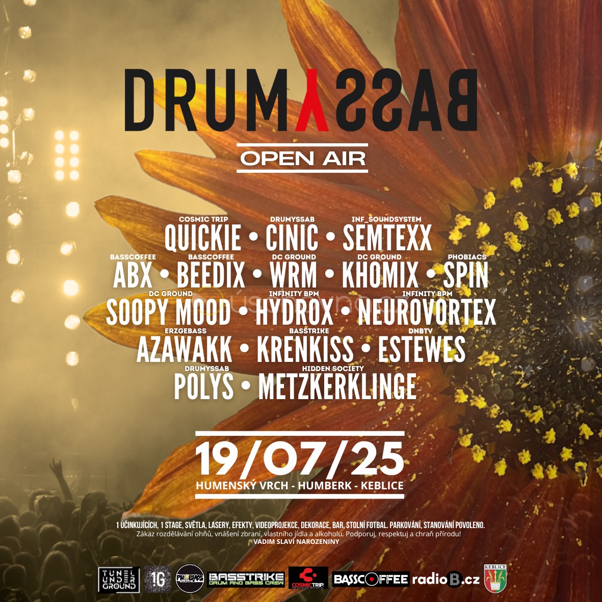 Sdílej, zvi přátele, vkládej událost do příběhu dne, zapoj se a buď součástí DRUMYBASSY OPEN AIRu a tím se automaticky účastníš slosovatelné soutěže o 2 volné vstupy a welcome drink zdarma. Vyhlášení 2 dny před konáním. Sleduj událost.