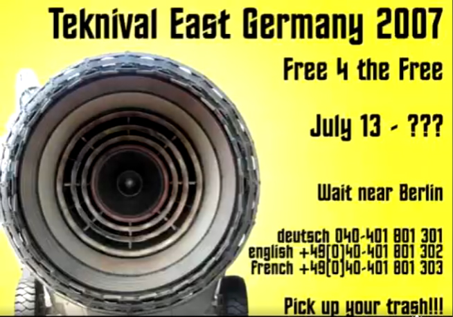 Teknival organisé près de Berlin en Allemagne, du 13 au 16 juillet 2007. Avec Hekate, Tomahawk, TKO, Desystematik SoundLab, Monoton, Goa Pants, System Anon, Strahov, Xinix, Cyberrise, Wanted BZH/Dezede...