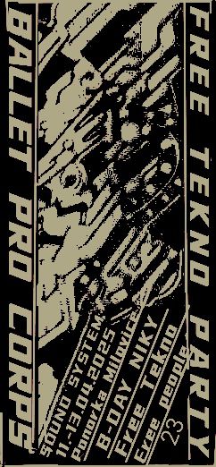 Free tekno party zahraje vám Sound system BALLET PRO CORPS a hosté soundu, narozeniny slaví nová členka soundu naše baletacka niky. Akce bude celý vikent od 11-13.04. 2025, bar, stěna, videoprojekce,, party se bude konat v Milovicích v ponorce GPS den konání akce, těšíme se free party free people