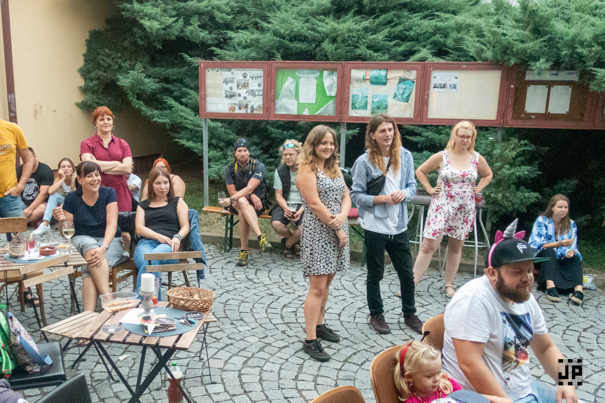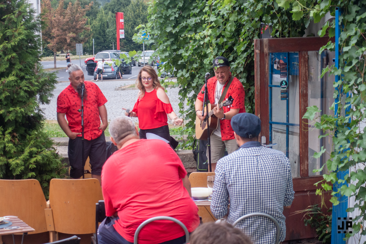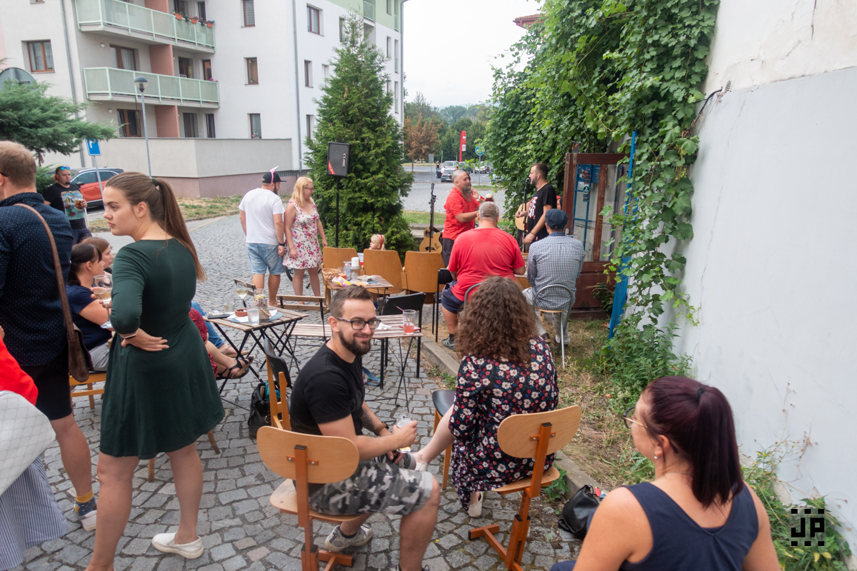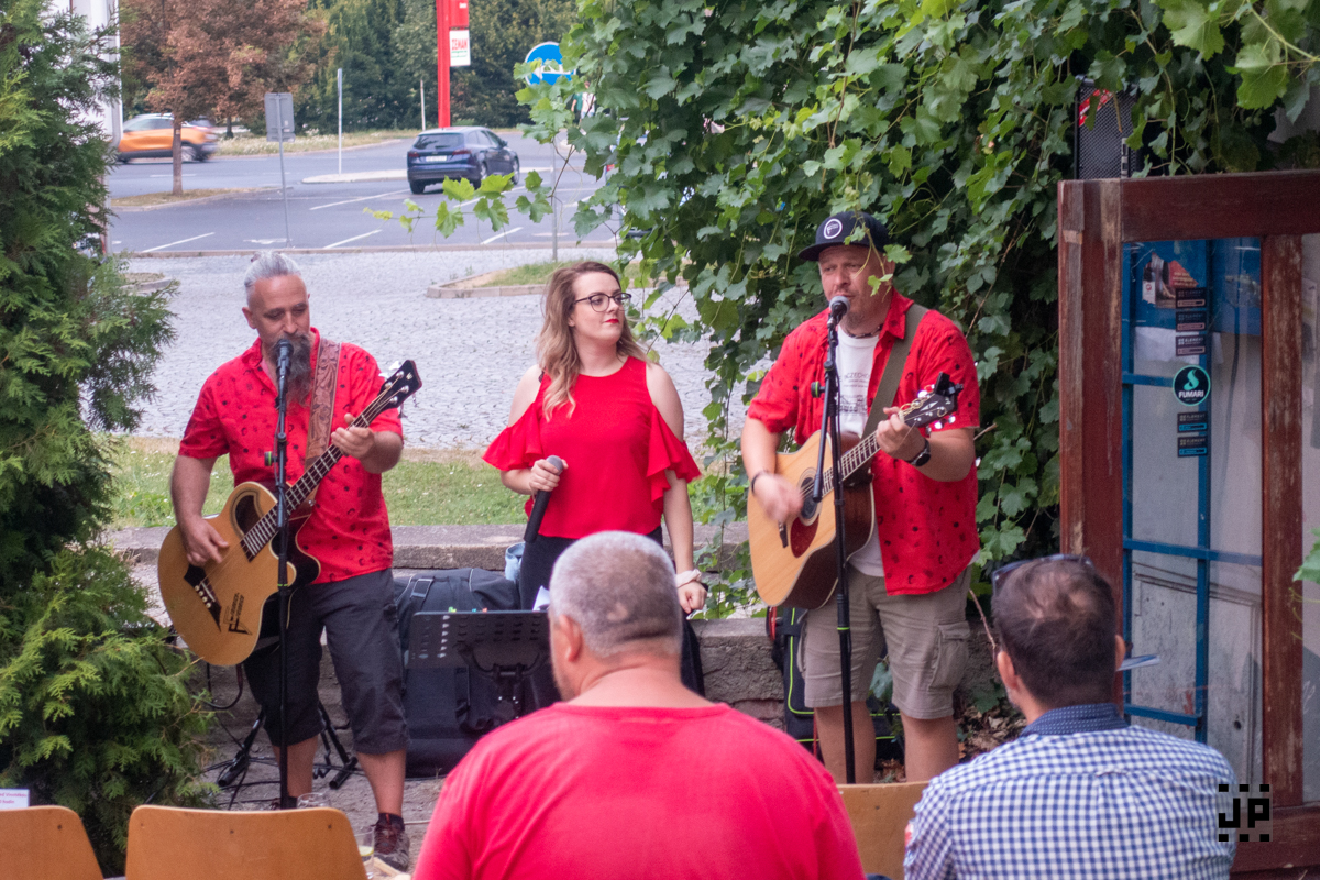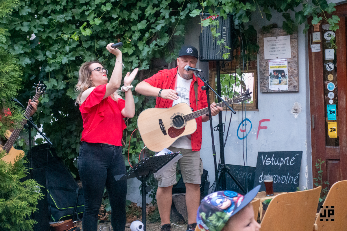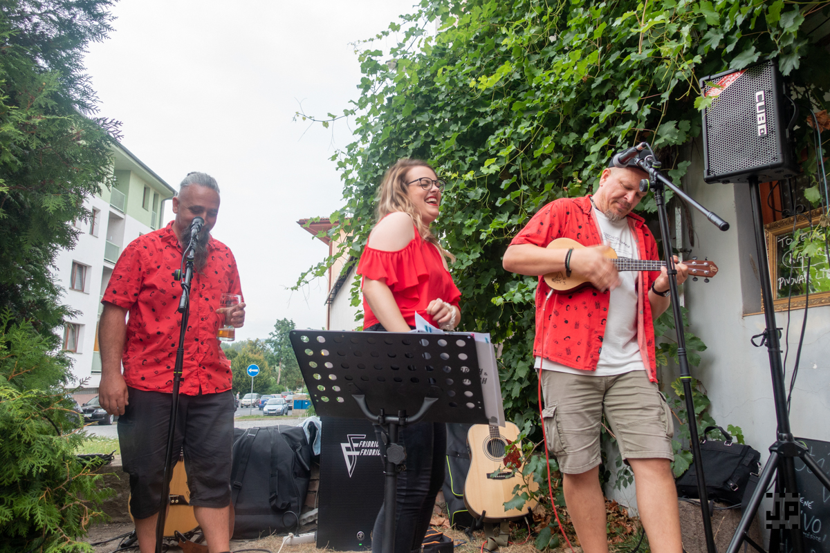 Acoustic-rock kapela Fridrich & Fridrich a jejich vystoupení před čajovnou s hojnou účastí. Čajovna - vinotéka bez názvu, Lovosice.