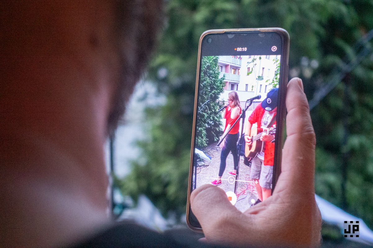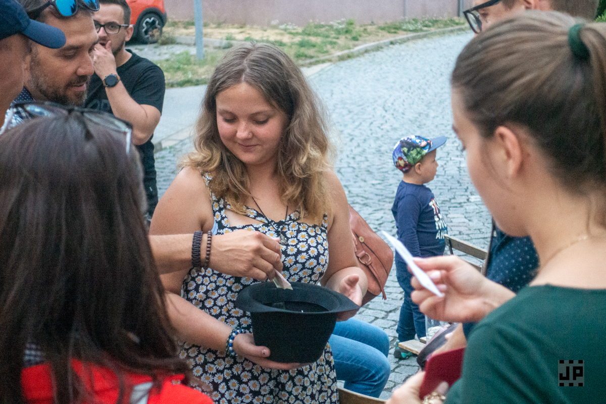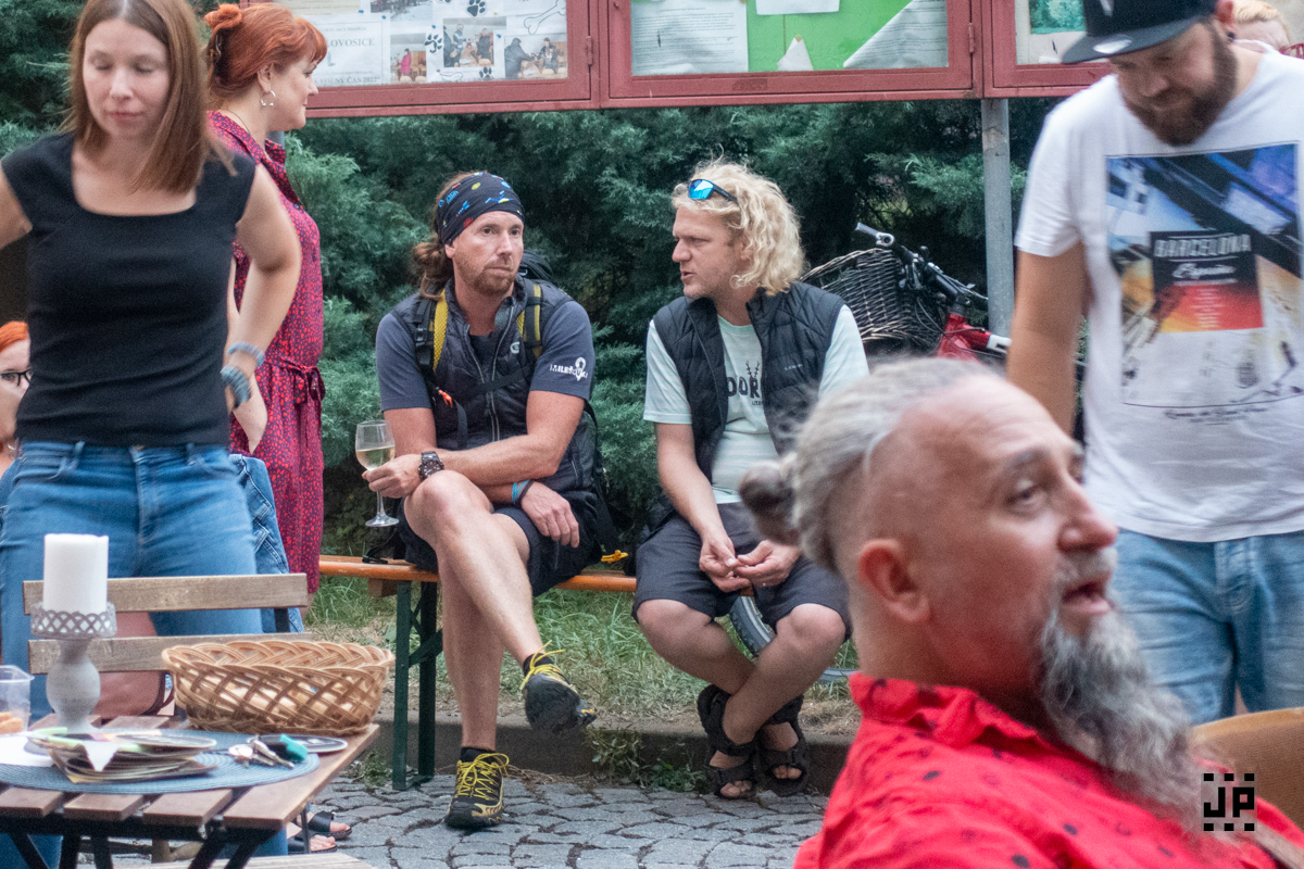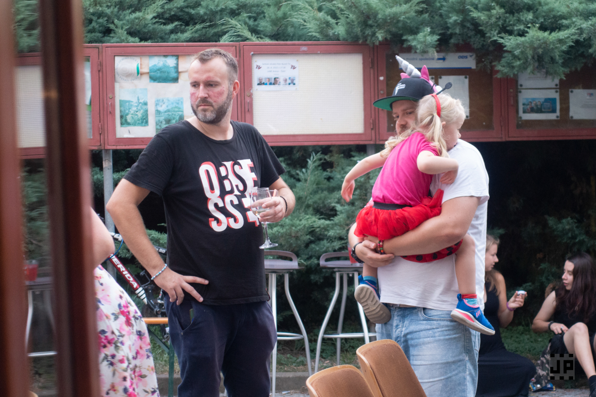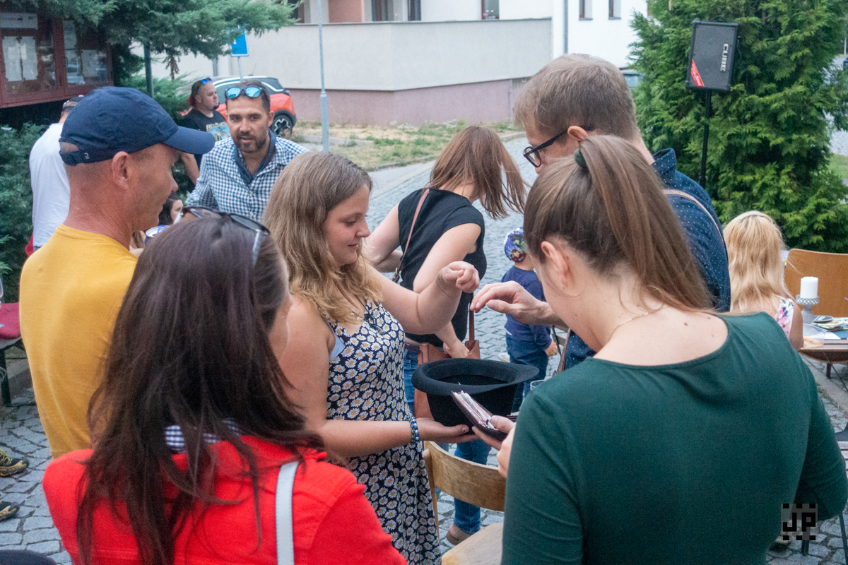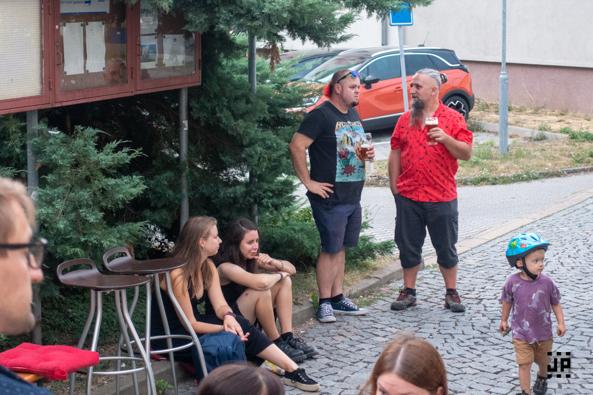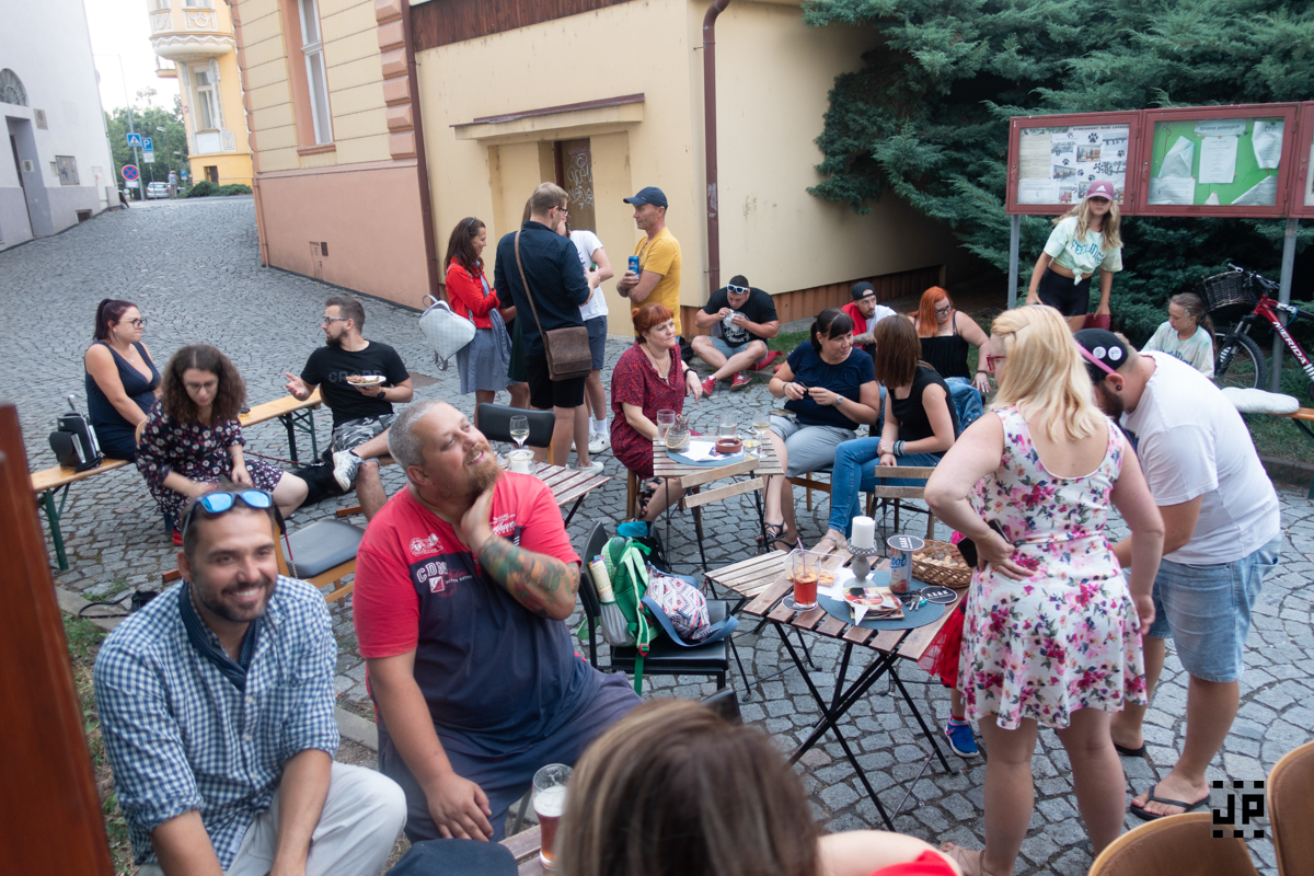 Acoustic-rock kapela Fridrich & Fridrich a jejich vystoupení před čajovnou s hojnou účastí. Čajovna - vinotéka bez názvu, Lovosice.