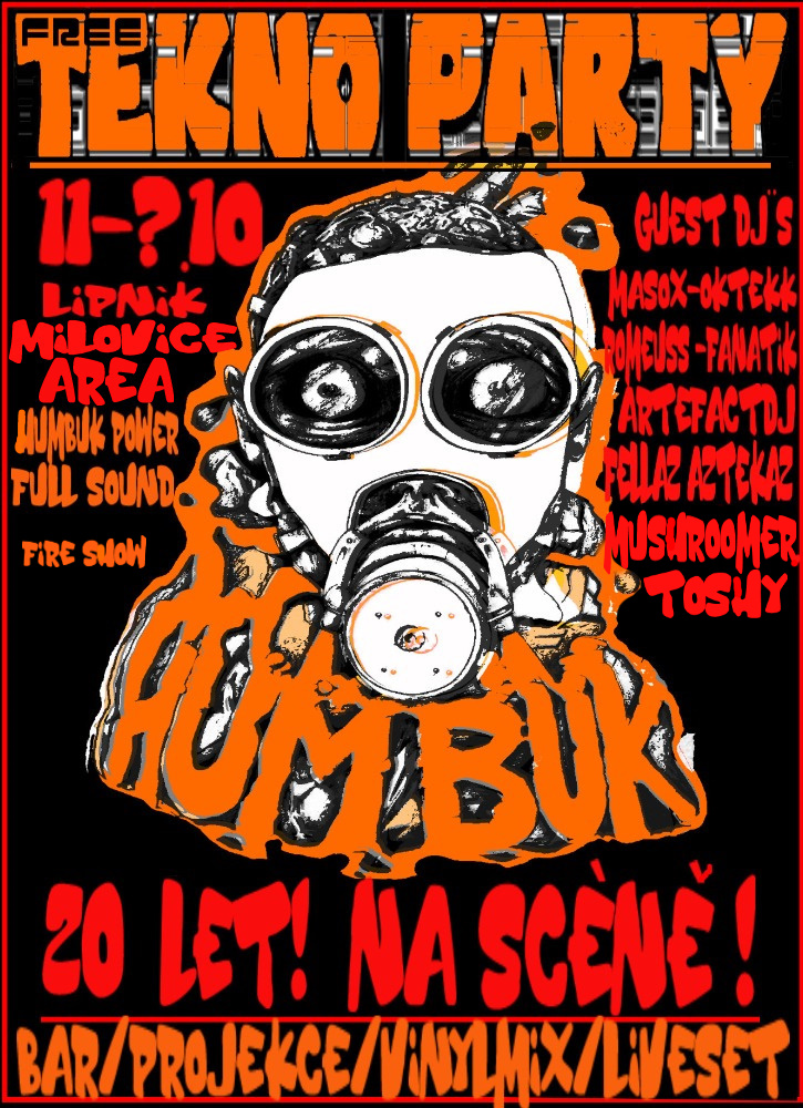 Humbuk slaví po všech úskalích a peripetiích 2. kulatiny, a to není zrovna málo. Když jsme to tehdy zakládali, nikdo nevěděl, jak dlouho to pojede, chtěli jsme jenom hrát freetekkno. Dělat freetekkno party je někdy fajn a někdy míň fajn, ale kolektivní extáze navozená repetitivním beatem nás vždy nabije nepopsatelnou energií, která nám dává sílu pokračovat dál. Sejdeme se u beden, neboli v hvězdných výšinách! Takže dobrou náladu a krýgly s sebou, ať šetříme planetu, na místě bude vybavenej bar i jídlo. GPS klasicky v den akce.