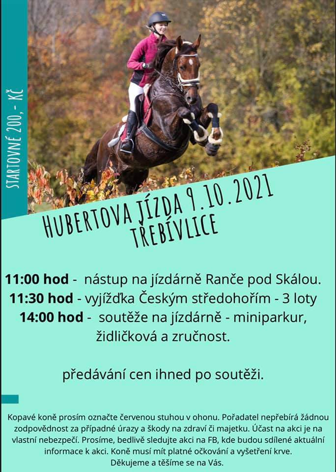V sobotu 9.10. jsme pořádali již 9. ročník Hubertovy jízdy v Třebívlicích. Počasí se dokonale vydařilo a přispělo tak k dobrému dojmu z celého dne. Klasicky se jelo rozděleně na tři loty podle náročnosti a po návratu všech jezdců se konalo pár sranda závodů na jízdárně. Děkujeme všem za hojnou účast, sponzorům za podporu a našim jezdcům a přátelům, že se organizačně angažovali. Bohužel jsme jediní, kdo v okolí tuto akci ještě stále pořádá, přitom tomu není tak dávno kdy tuto tradici drželi 4 vesnice vždy víkend po sobě v říjnu. Příští 10. ročník rozhodně bude stát za to.