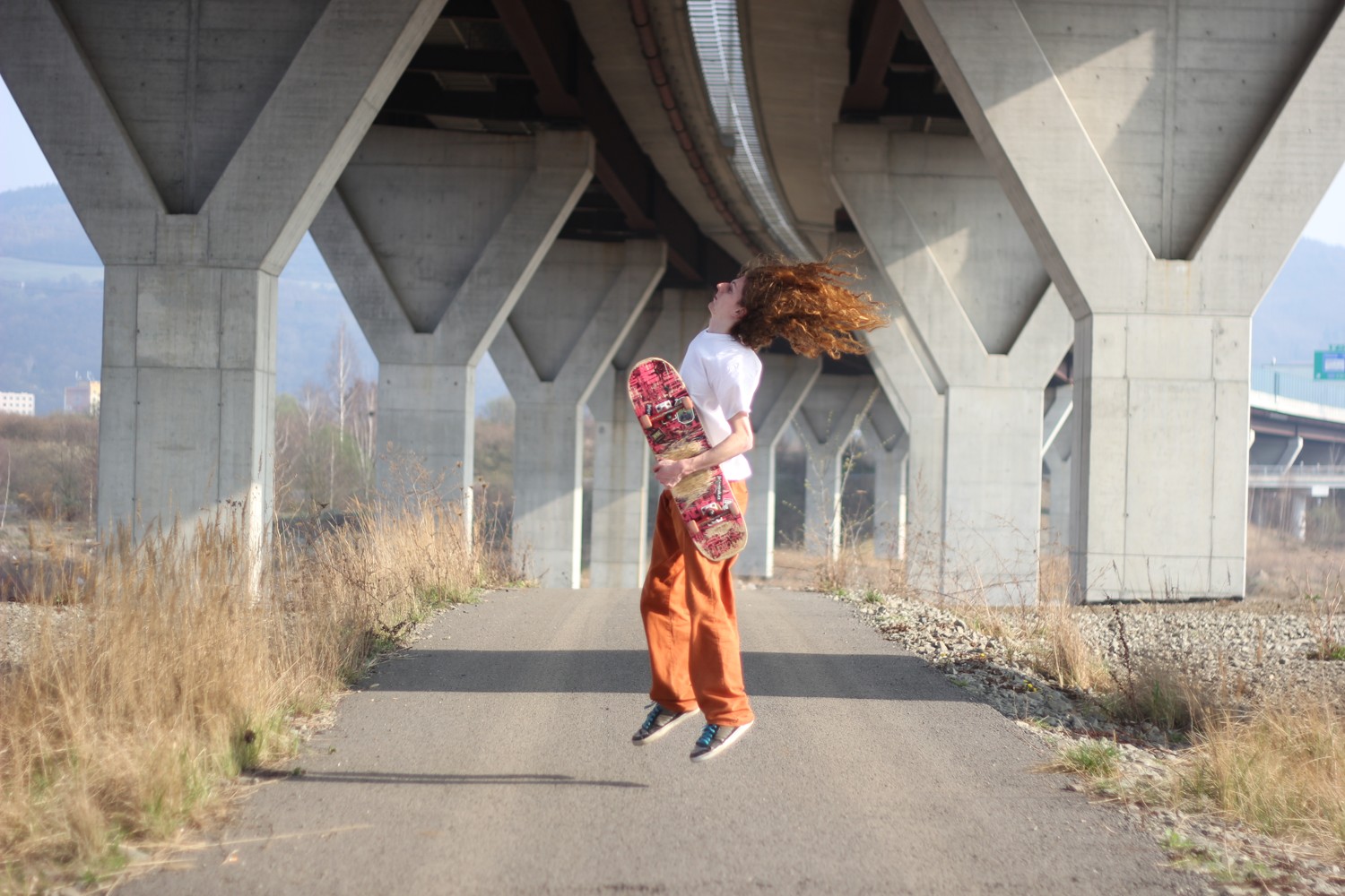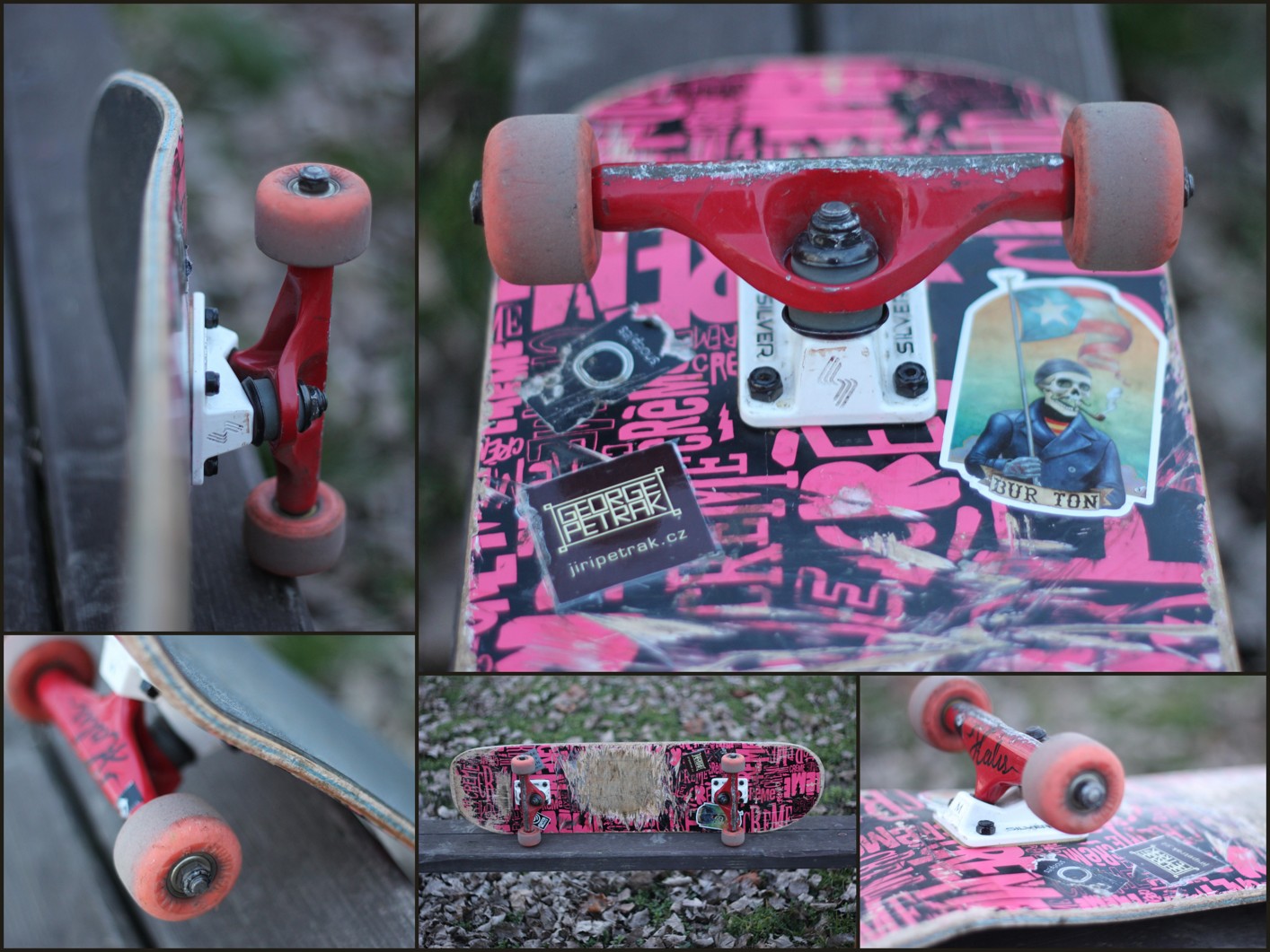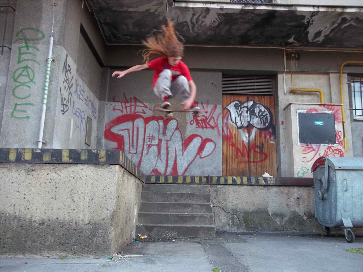 Moje úplně první fotky na skateboardu. Bylo mi okolo deseti let a skateboard byl v té době na mě moc velký. První jsem si koupil v ústeckém supermarketu a nevydržel dlouho. Za jeden měsíc moje ollie stouplo zhruba na patnáct centimetrů a to vzhledem k v mé velikosti byl opravdu pokrok, když mě nikdo neučil. Často jsem střídal nekvalitní desky z čínského javoru. Na fotce mě vidíte, jak jdu pod centrum v Rebook mikině, prvních skate botech a širokých kapsáčích. V této době ještě nebyl skatepark, takže se jezdilo v centru města po kvalitním mramorovém plácku.