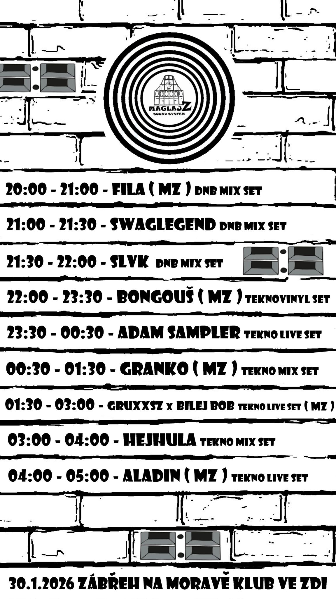 Ejou bratři a sestry, maglajZ doleti udělat maglajZ do klubu ZEĎ - Zábřehu na Moravě, jedná se o dobročinnou sbírku který přispěje na dokončení funkčnosti celého našeho zvuku, tak přijď podpořit, zapařit a srazit se společně v novém roce v jedné zdi, doval ať můžeme v roce 26, hned co se udělá hezké počasí slunko začne vypalovat oční bulvy a komáři nám budou krást krev tahat celý náš mZ zvuk ven a společně dělat velké činy