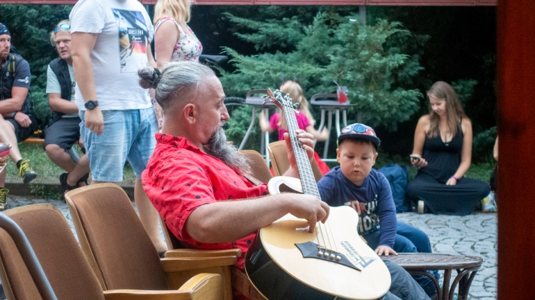 Acoustic-rock kapela Fridrich & Fridrich a jejich vystoupení před čajovnou s hojnou účastí. Čajovna - vinotéka bez názvu, Lovosice.