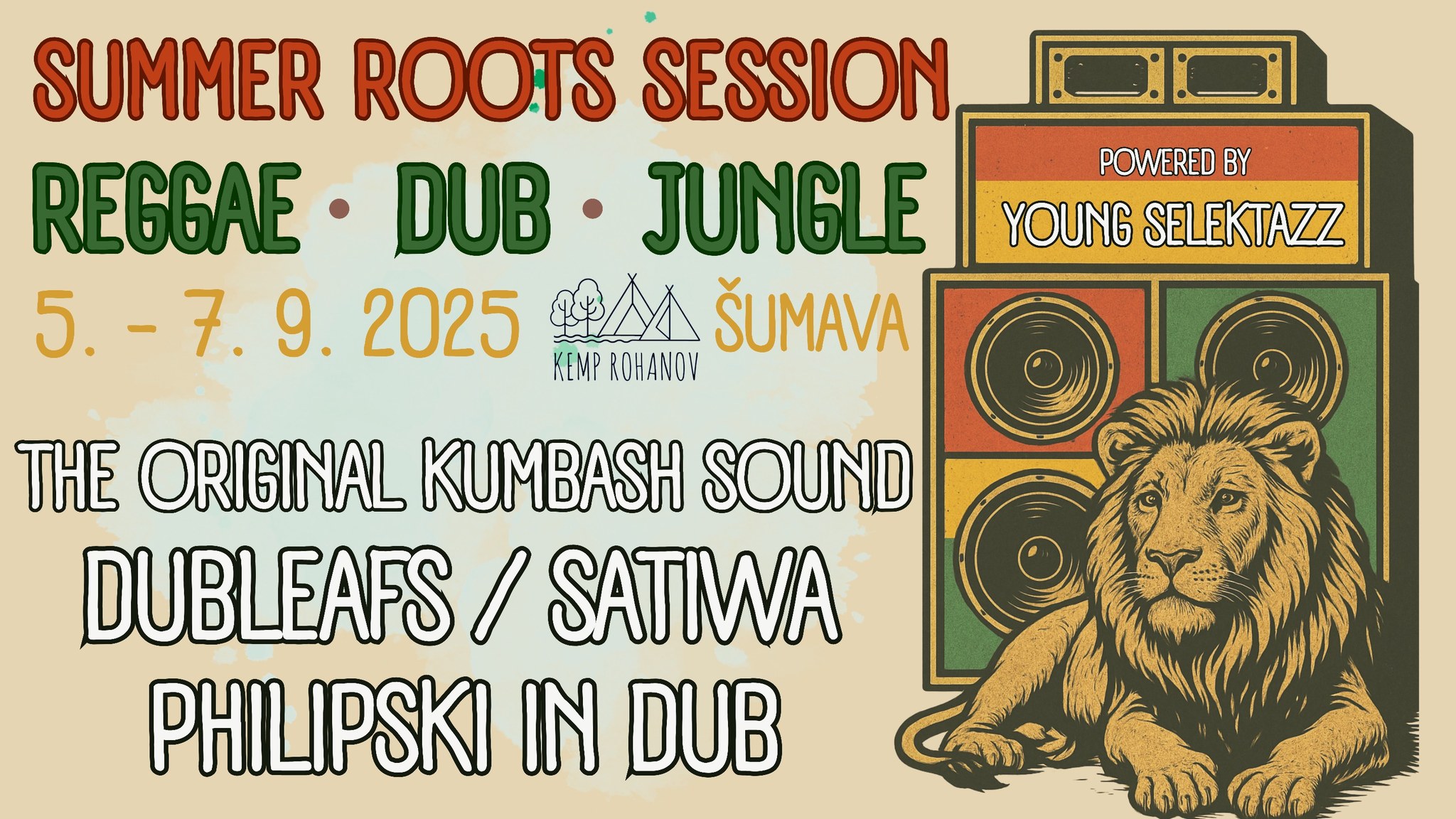 přijeďte s námi strávit jeden z posledních letních víkendů v krásné šumavské krajině na vlně REGGAE, DUB a JUNGLE music. Akce se bude konat v kempu Rohanov, kde se můžete ubytovat ve stanech nebo karavanech a kde Vás čeká magická krajina, koupání, občerstvení i spousty vyžití pro vaše ratolesti