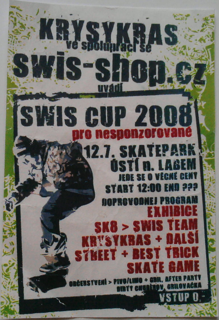 Závod Krysykras ve spolupráci se swis-shop.cz pro nesponzorované v Ústí nad Labem se jel dne 12. 7. 2008. Vadilo mi, že v polovině akce začalo pršet a best trick se jel nakonec na mokré zemi.