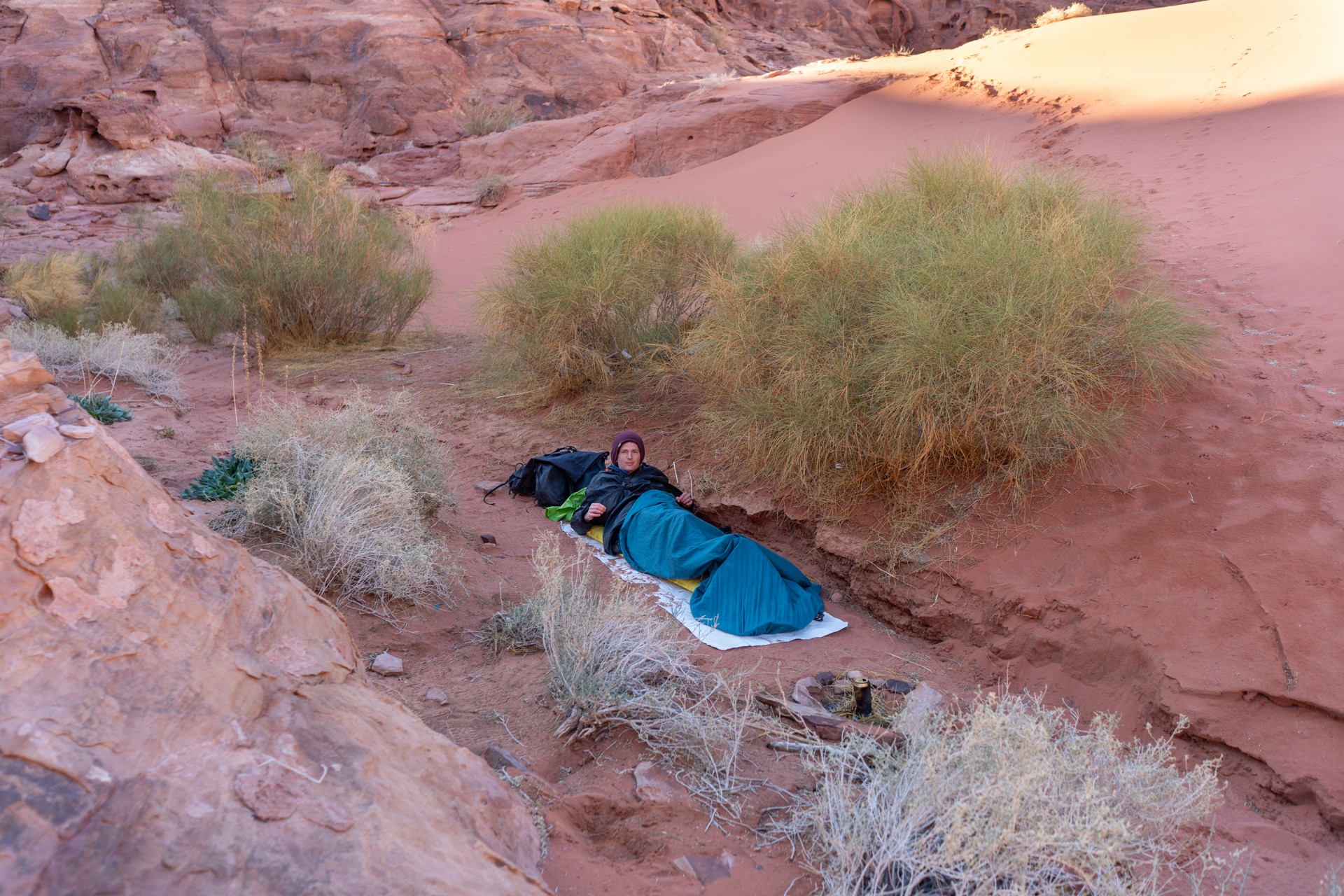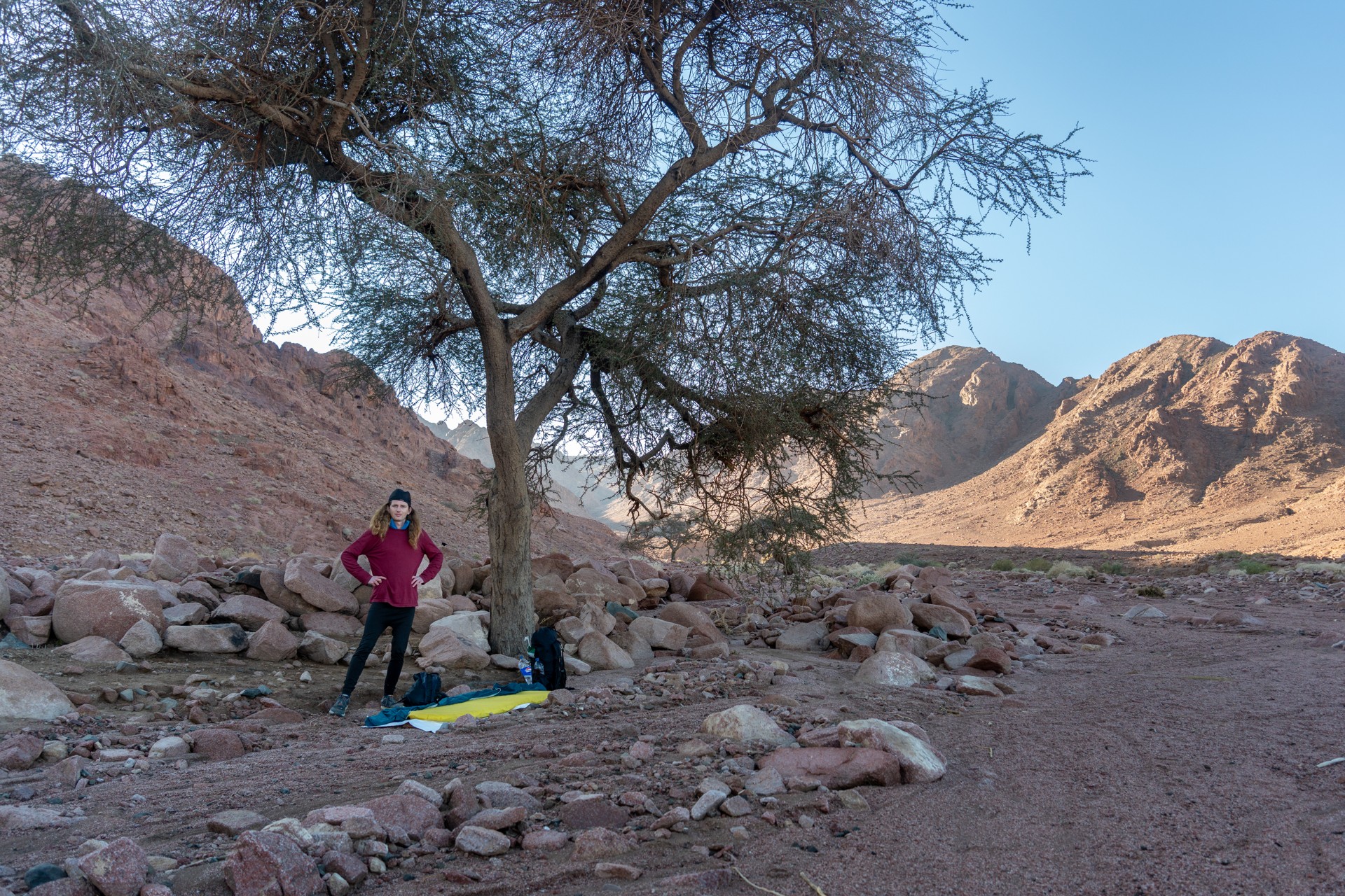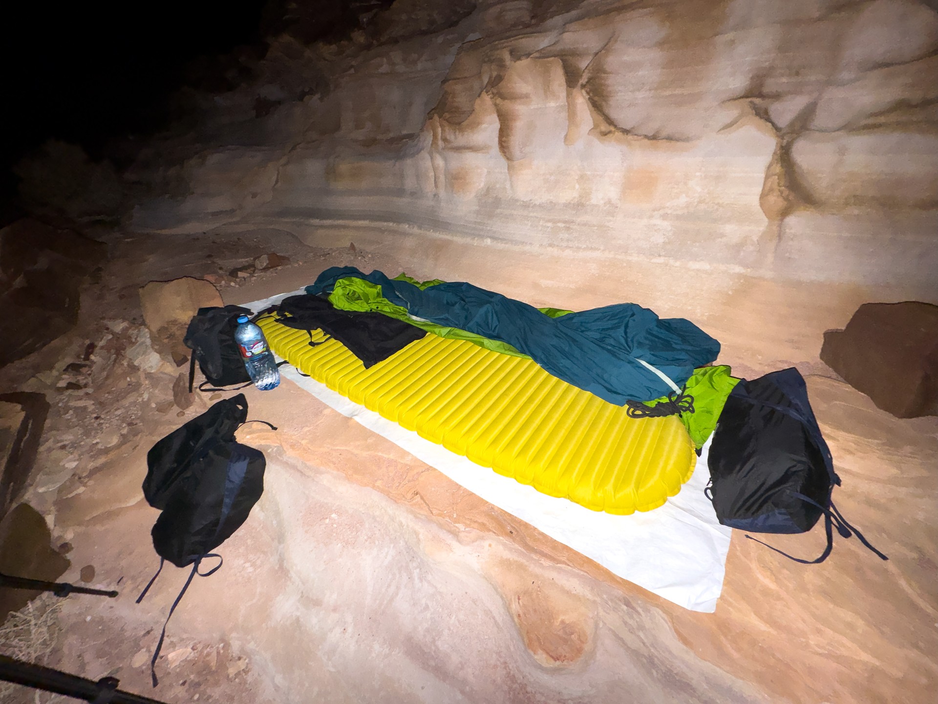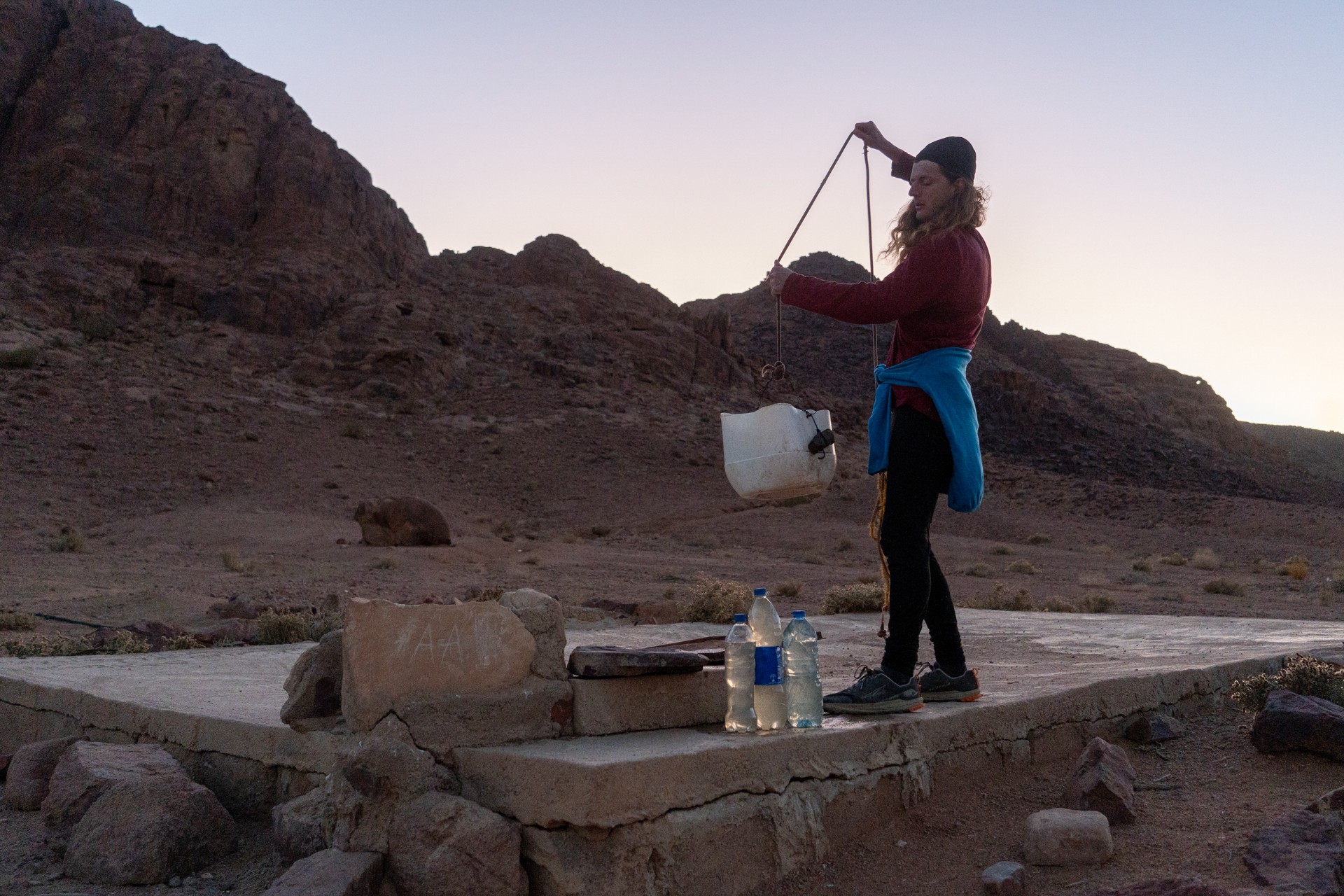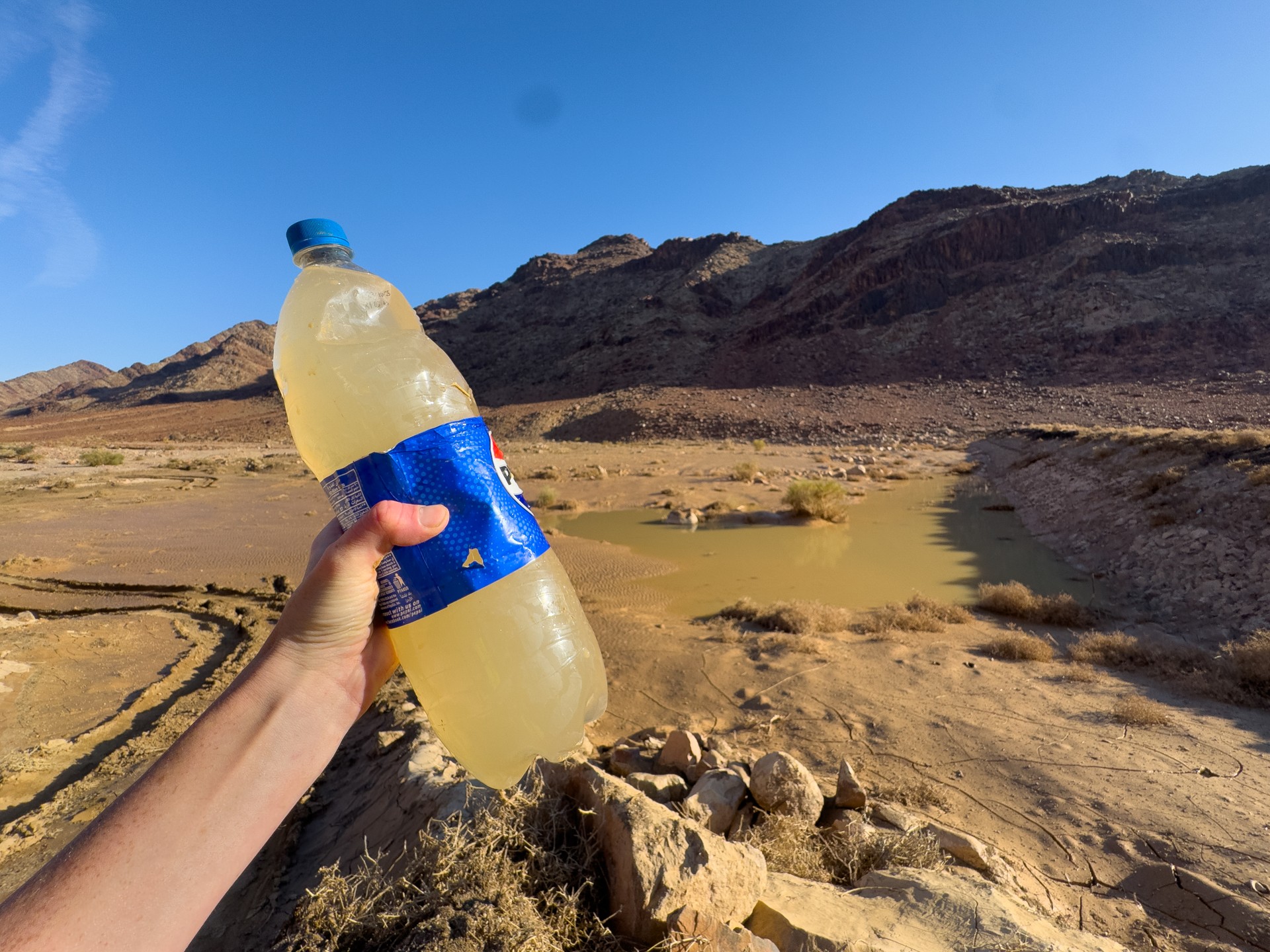 V prosinci se zde výjimečně objevily deště, které nejsou pro tuto oblast obvyklé, a díky nim bylo možné cestou nabírat vodu z kaluží na skalách. Zároveň bylo možné doplnit vodu z podzemní nádrže. I tak můj batoh s šesti litry vody, fotografickou technikou a jídlem vážil přes 20 kilo. Díky příjemnému počasí se člověk příliš nepotil, přesto bylo kvůli suchému pouštnímu vzduchu důležité dbát na pitný režim. Jako vždy se dostavil i nepříjemný pocit podrážděného nosu, kdy se při smrkání objevovala krev.