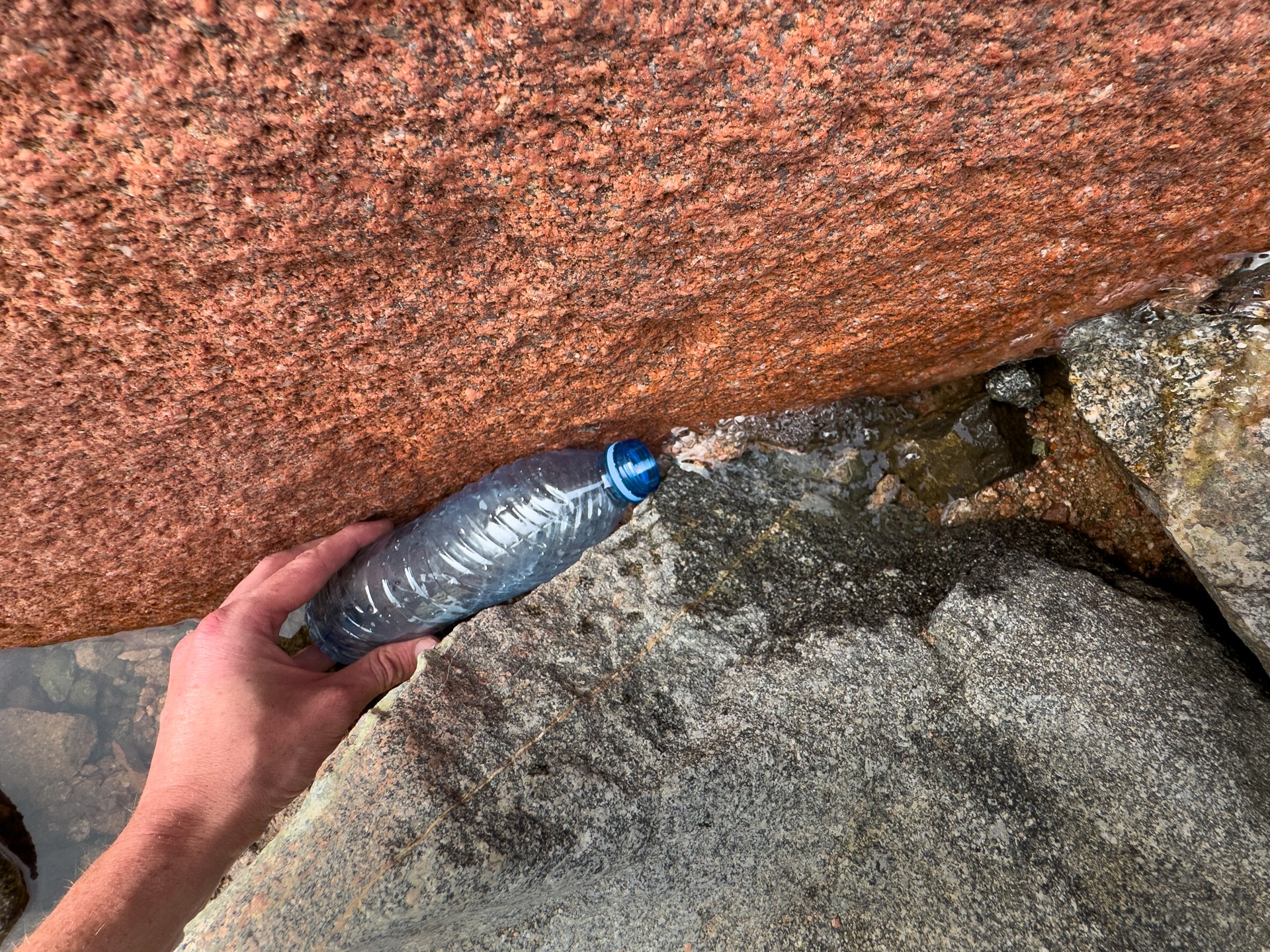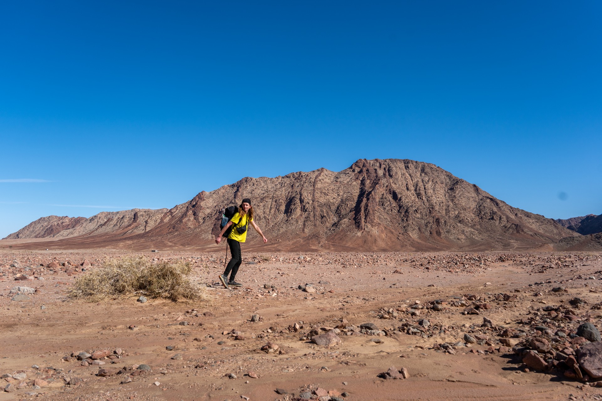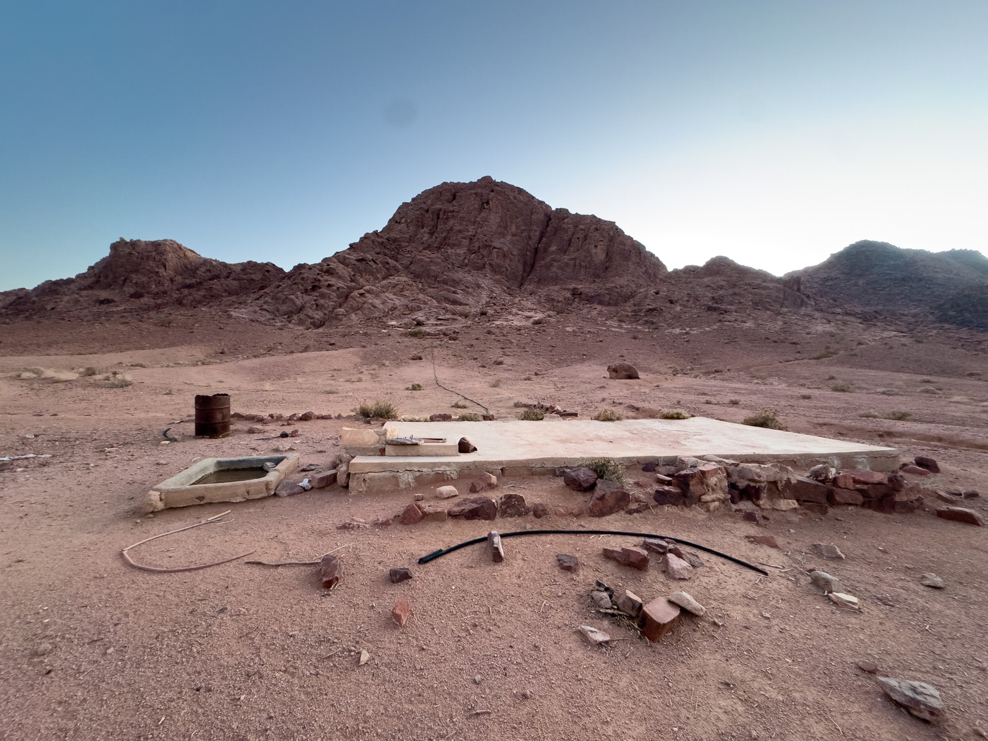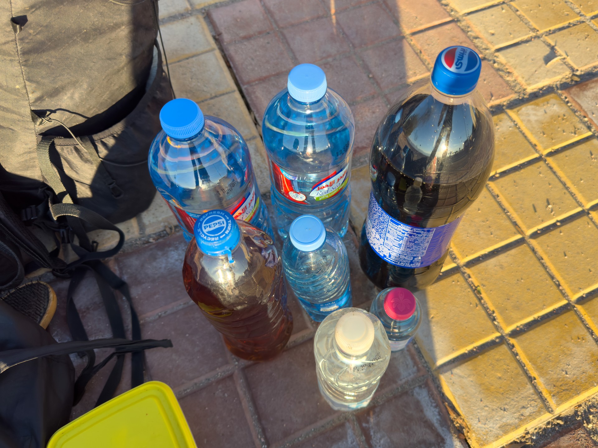 V prosinci se zde výjimečně objevily deště, které nejsou pro tuto oblast obvyklé, a díky nim bylo možné cestou nabírat vodu z kaluží na skalách. Zároveň bylo možné doplnit vodu z podzemní nádrže. I tak můj batoh s šesti litry vody, fotografickou technikou a jídlem vážil přes 20 kilo. Díky příjemnému počasí se člověk příliš nepotil, přesto bylo kvůli suchému pouštnímu vzduchu důležité dbát na pitný režim. Jako vždy se dostavil i nepříjemný pocit podrážděného nosu, kdy se při smrkání objevovala krev.