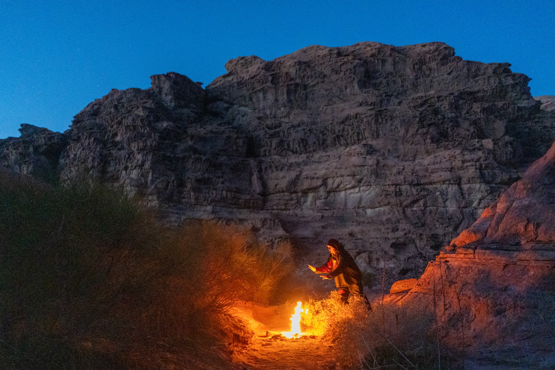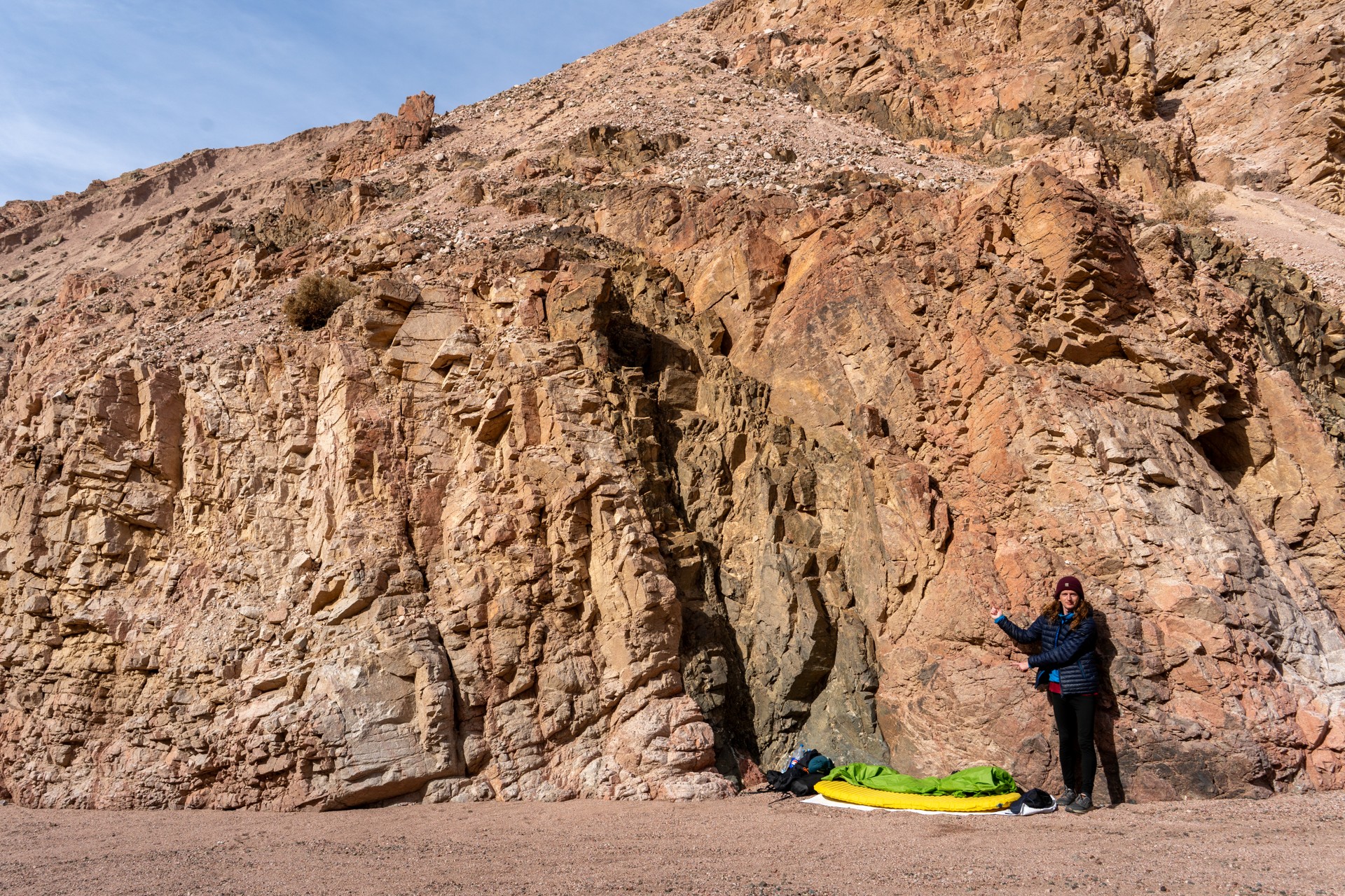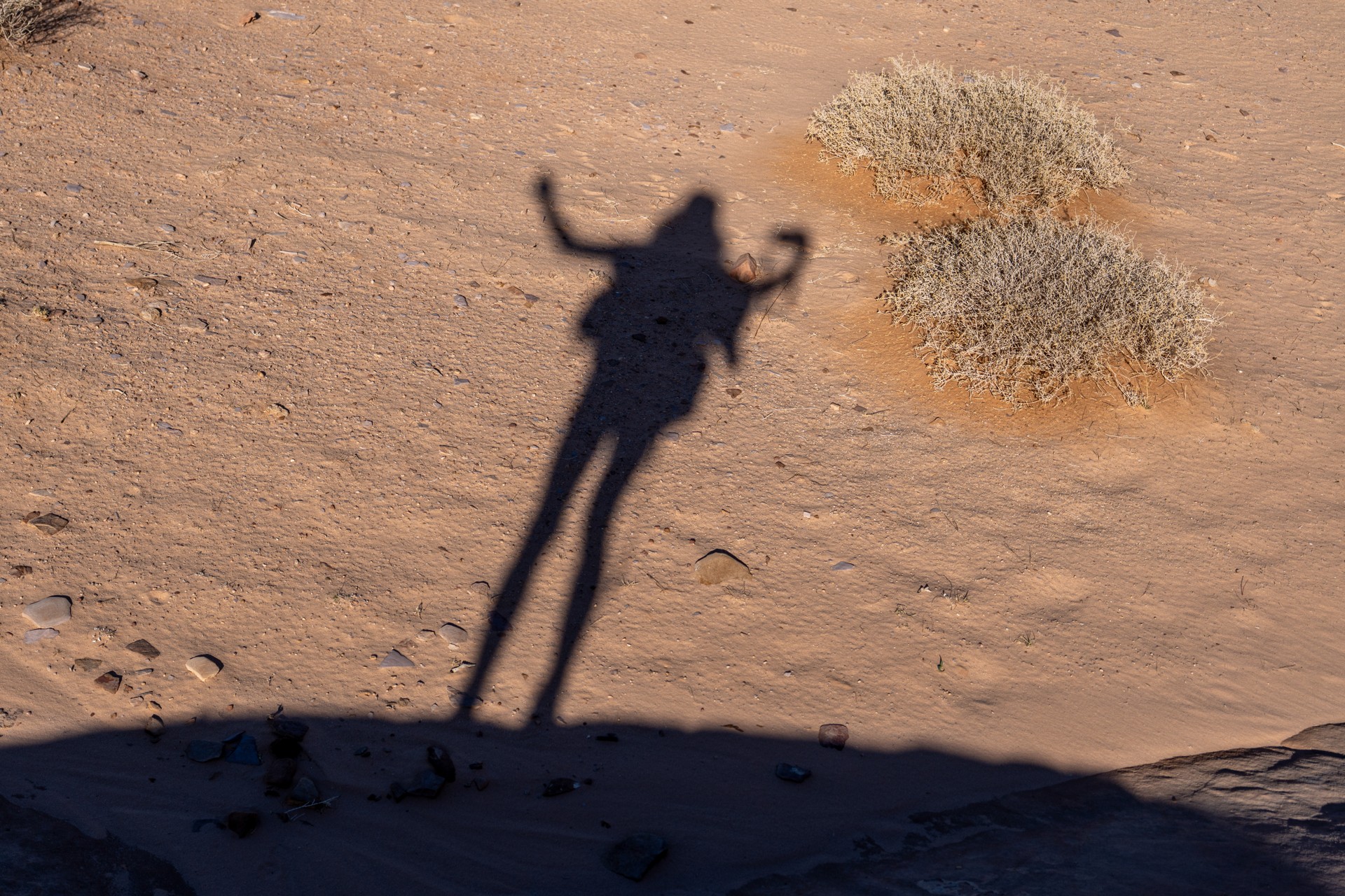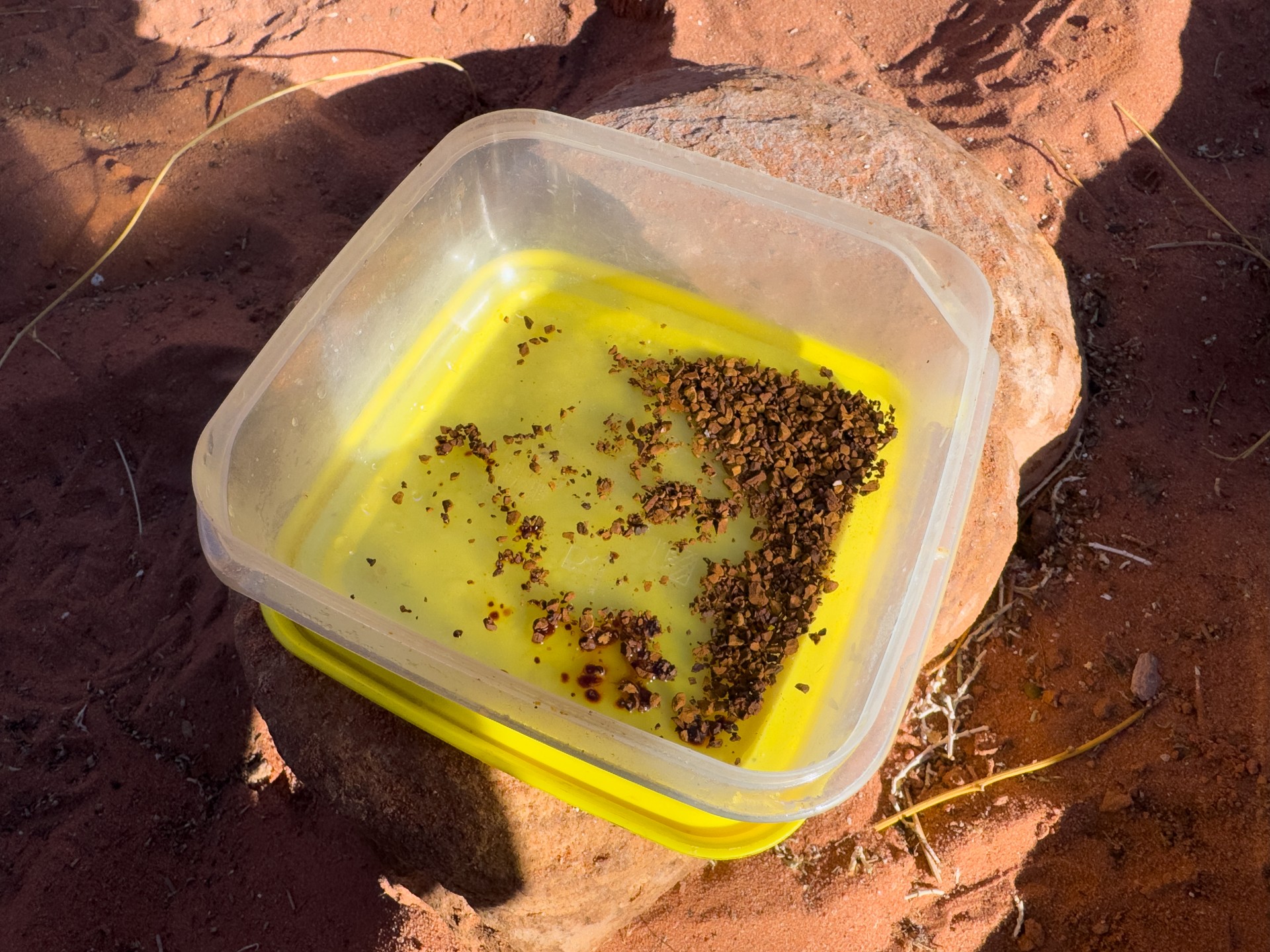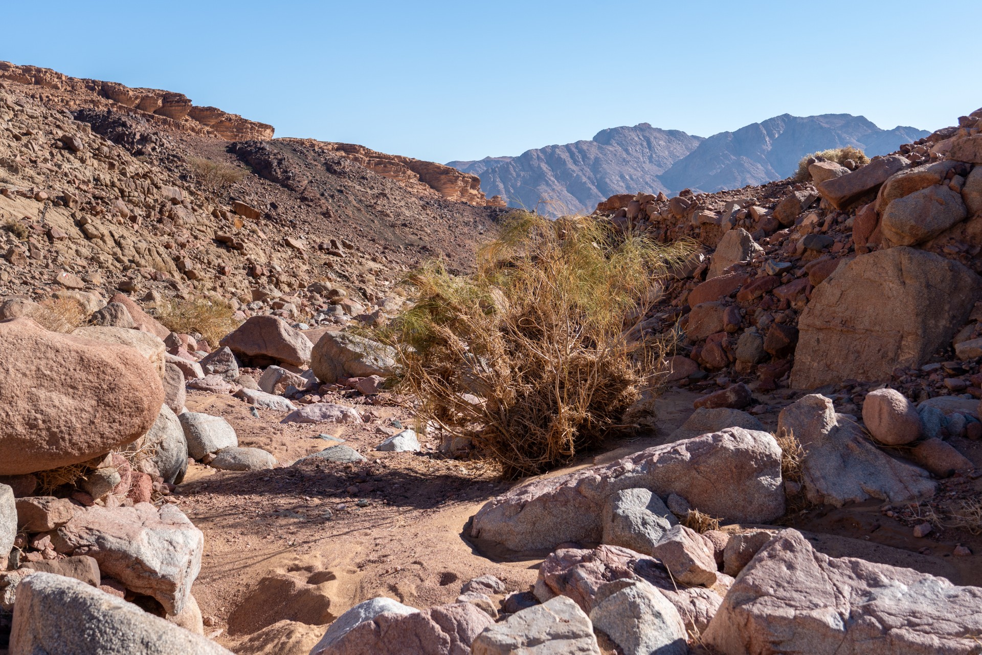 V prosinci se zde výjimečně objevily deště, které nejsou pro tuto oblast obvyklé, a díky nim bylo možné cestou nabírat vodu z kaluží na skalách. Zároveň bylo možné doplnit vodu z podzemní nádrže. I tak můj batoh s šesti litry vody, fotografickou technikou a jídlem vážil přes 20 kilo. Díky příjemnému počasí se člověk příliš nepotil, přesto bylo kvůli suchému pouštnímu vzduchu důležité dbát na pitný režim. Jako vždy se dostavil i nepříjemný pocit podrážděného nosu, kdy se při smrkání objevovala krev.