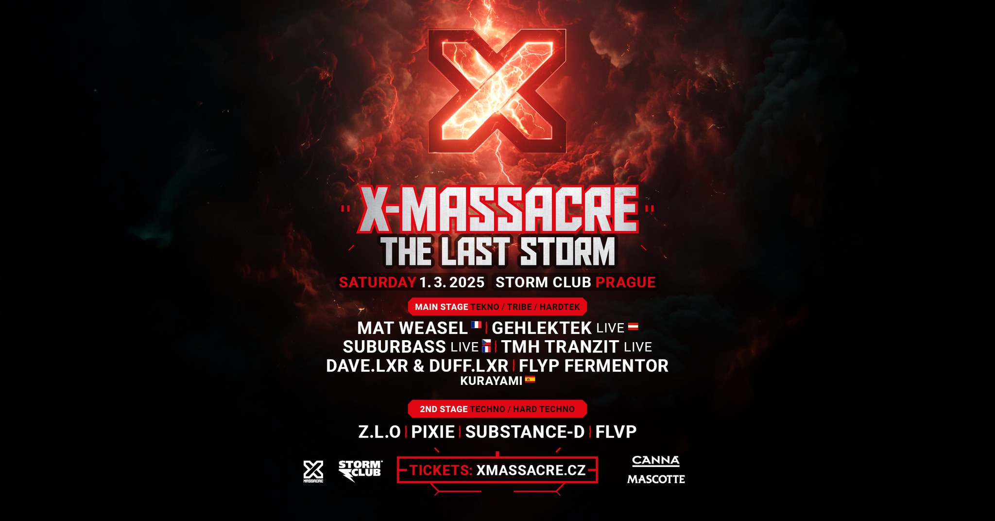 As you may already know, the legendary Storm Club Prague is closing its doors in April 2025. And since X-Massacre is closely connected to this club, we’ll be saying goodbye in grand style! So on Saturday 1st March you can look forward to 2 stages (Tekno Main Stage, 2nd Stage techno & hard techno), a packed line up headed by Mat Weasel and special visuals. Don’t miss it, it will be the very last tekno rave in Storm!