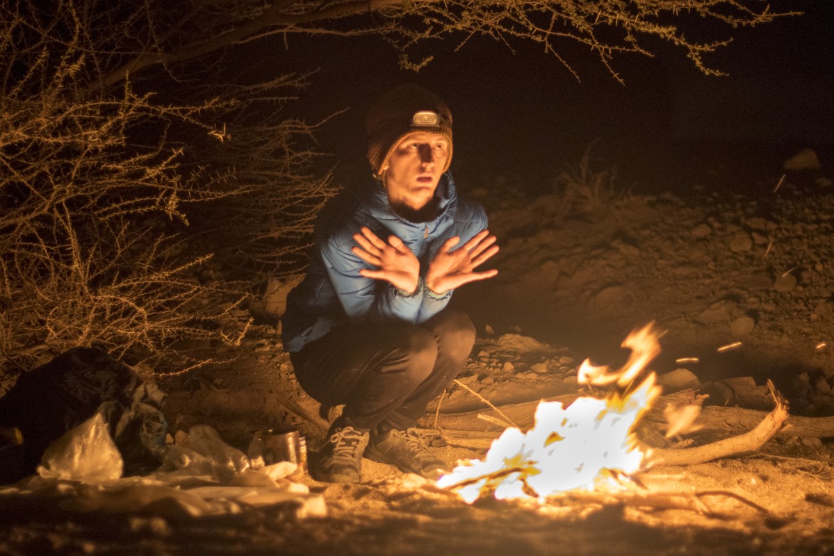 Vycházím z kempu zásoben vodou najít své oblíbené místo za skalou k utáboření. Avšak kvůli špatné orientaci ve tmě odbočím dříve do skal. Periferně zahlédnu zvíře bez známek agresivity, přičemž jsem v klidu a nehýbu se. Vypadá jako pes, vlčák, ale podivně chrchlá jako prase. Ve svém teritoriu mě následoval až jsem se od něj vzdálil a našel místo k přespání. Najdu klacky k rozdělání ohně. Zcela nečekaně našlápnu do bahnité louže a ihned ustupuji. Občas tu bývají bleskové záplavy. V noci začne silně foukat vítr, který mi rozfoukává oheň. Se suchým dřevem plápolá intenzivně. Udělám si polévky a uvařím rýži.